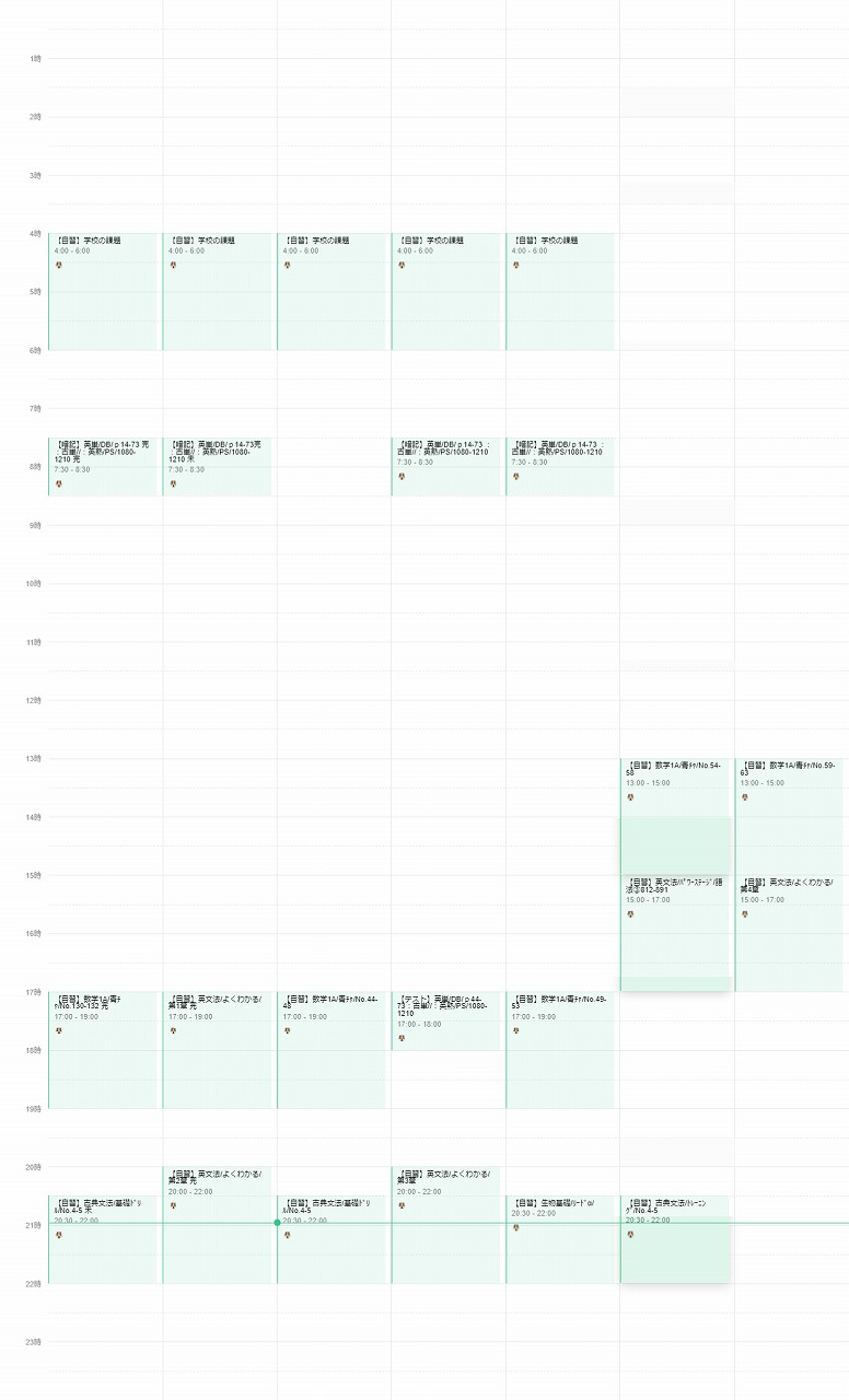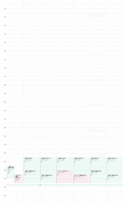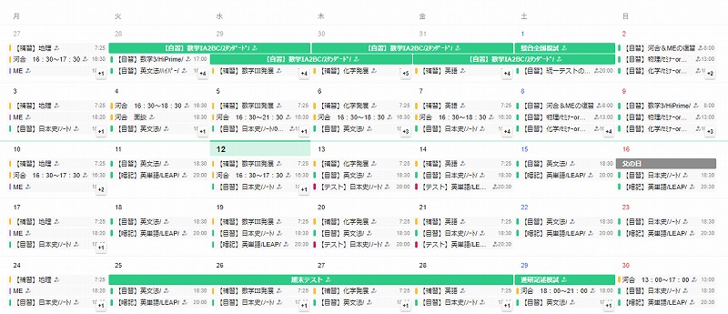 STEM医進ゼミナールでは、個別にスケジュールを作成しております。スケジュールには、生徒が塾に来られる日時を事前にヒアリングし、その中で指導の日や科目、指導時間などを設定します。さらに、自習、英単語・英熟語・古典単語・漢文句形などの暗記とテスト、学校の宿題や予習復習、中間期末テスト対策など全てを含んだ内容となっております。管理者と生徒の双方からの書換が可能なシステムを採用している為、生徒はスケジュールに則り、その日の学習を行い、学習が終わったら「済」、できなかったら「未」を付けてもらいます。生徒が塾にいなくても、何をやっているか全て管理ができる為、細部まで見ることができます。